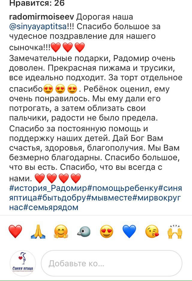 «Большое спасибо от семьи Асафовых за вкусный торт и подарки! Сема всем машет ручкой и говорит СПАСИБО. Мы вас любим!»
