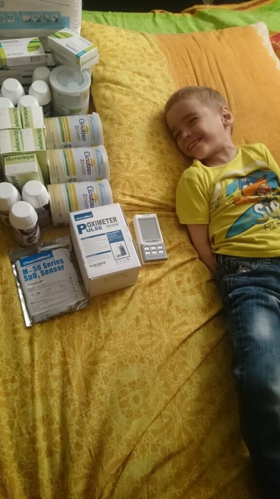 А на прошлой неделе мы передали пульсикометр, медикаменты, питание и канцтовары улыбашке Федору.