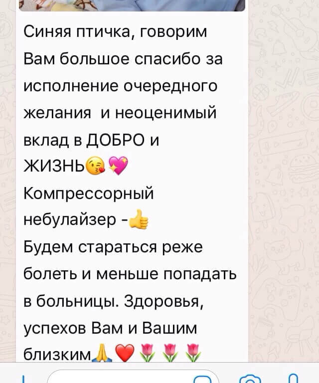 Захар Лобачев получил от нас компрессорный небулайзер, благодаря которому Виктория, мама мальчика, может с легкостью делать сложные ингаляции сыну.