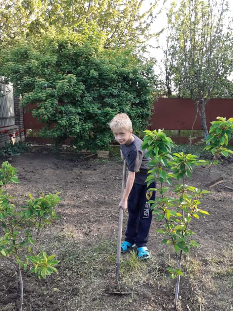 «Здравствуйте! Меня зовут Влад. Я подопечный «Синей птицы». Сейчас я нахожусь дома — очень весело и полезно провожу время. Я обожаю помогать маме в саду! Тяпкой я рублю сорняки, а мама потом собирает траву граблями. У нас настоящая команда.