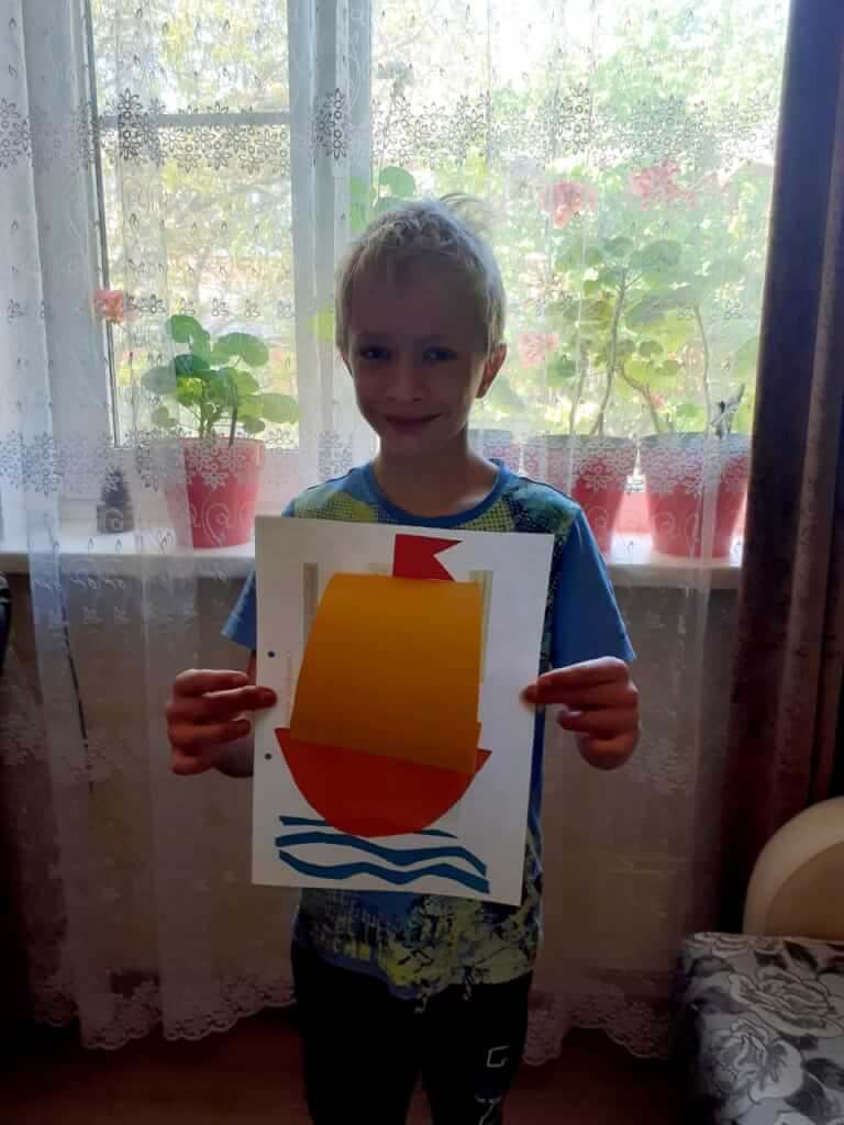 А еще, мы каждый день делаем поделки. Вчера сам сделал аппликацию — кораблик. Хочу добавить в свою комнату морских картинок, чтоб мечтать об отдыхе на море.»