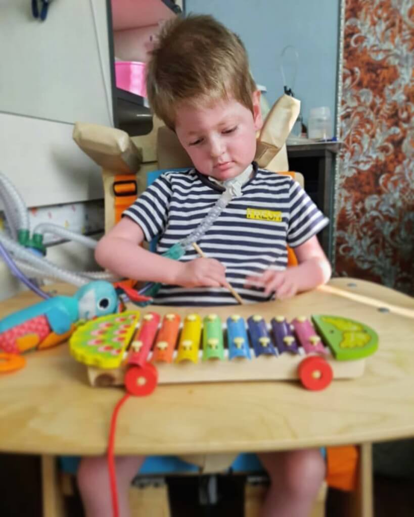«Из-за основного диагноза сына — одной из разновидностей мышечных дистрофий — ребёнок почти не ест самостоятельно, не жует и плохо глотает. Всю пищу мы перетираем, чтобы Радомир не подавился. Приходится кормить сына через нозогастральный зонд измельченной пищей.