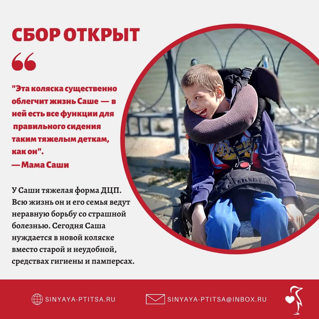 Любознательный и упорный Саша сейчас имеет возможность учиться правильно сидеть только на дорогостоящих курсах в Санкт-Петербурге. Чтобы особенный мальчик с непростой судьбой мог чувствовать себя комфортнее и приобретать необходимые навыки дома,