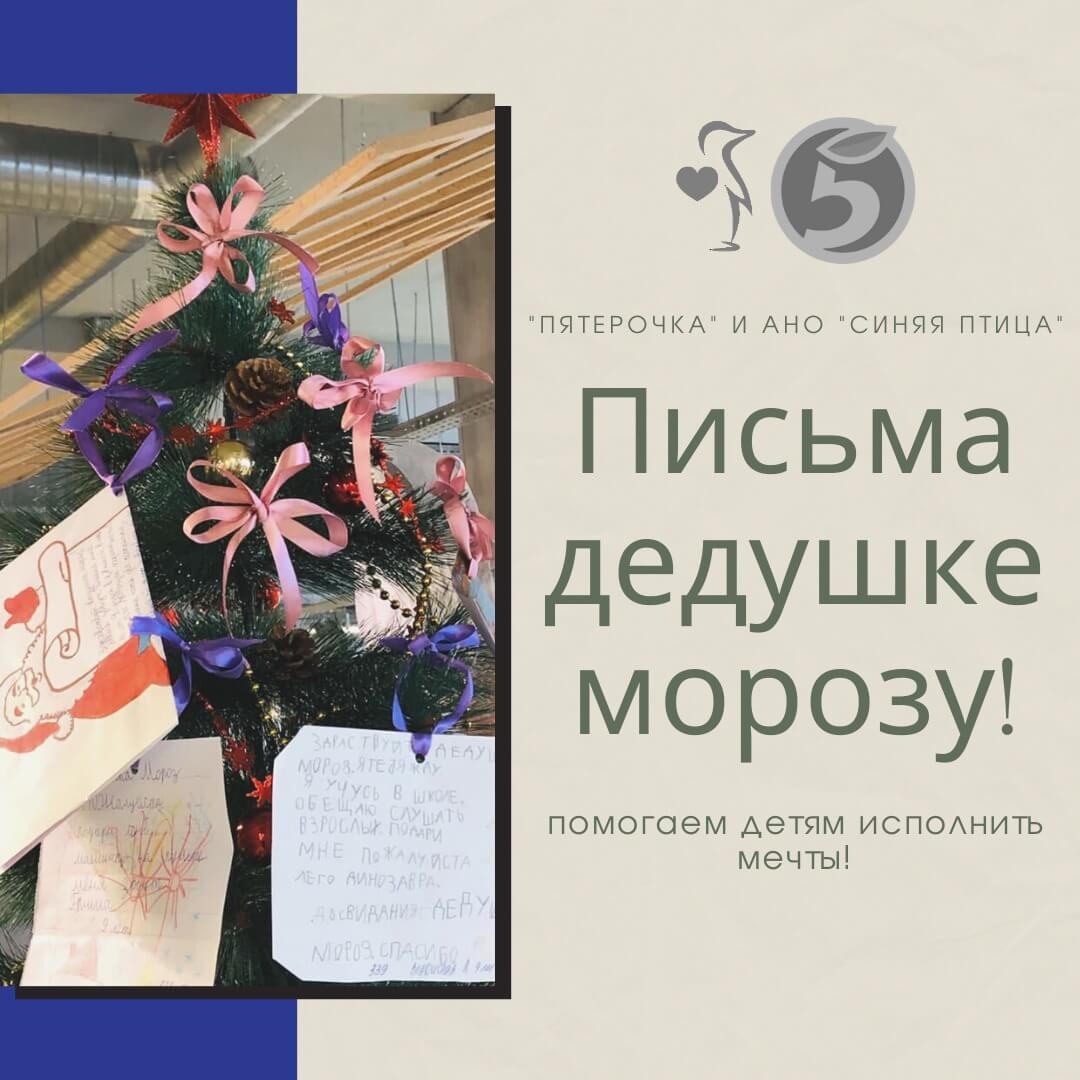 В 30 магазинах «Пятёрочка» Краснодара будут установлены новогодние ёлки, украшенные открытками с письмами детей, подопечных АНО «Синяя птица», Деду Морозу.