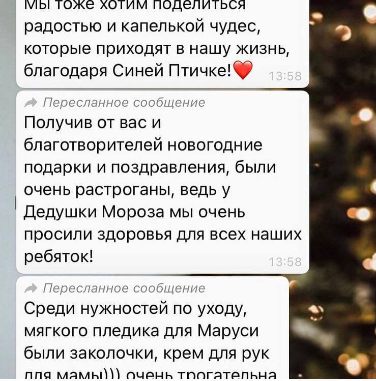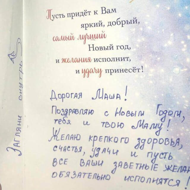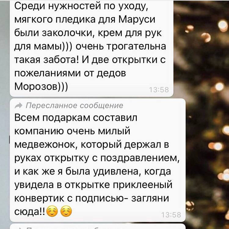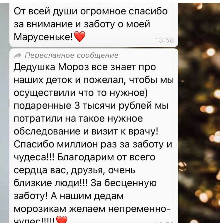 Вот и Маша с мамой уже несколько лет пишут письма Деду Морозу и передают их через наших помощников. Маша всегда просит что-то очень скромное, лишь бы Дедуля о ней помнил: варежки, носочки или красивые заколки (Маша их очень любит!). А в этом году в письме и вовсе оказалось одно желание — здоровье. В общем, мы сами не ожидали, что Дед такой Мороз! Подарок приехал Маше в виде милой мягкой игрушки, мы добавили чуть сластинки и всего самого необходимого для девчушки. А дома мама с Машей обнаружили внутри подарка…..денежный конвертик, равный той сумме, что была необходима для важного обследования! Вот тебе и здоровье, Маша!