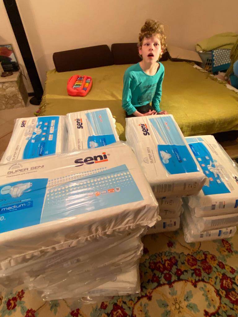 А подарок от добрых сердец — большое количество подгузников, сразу же расцвёл в душе нашего кудрявого подопечного хорошим настроением. Здорово, когда особенный ребёнок смеётся. И правда! Гора подгузников из 20 упаковок, подаренная малышу, не могла не удивить. Вот, что написала нам его мама: