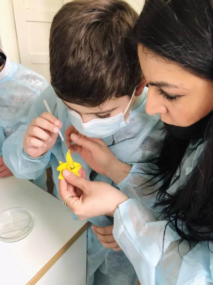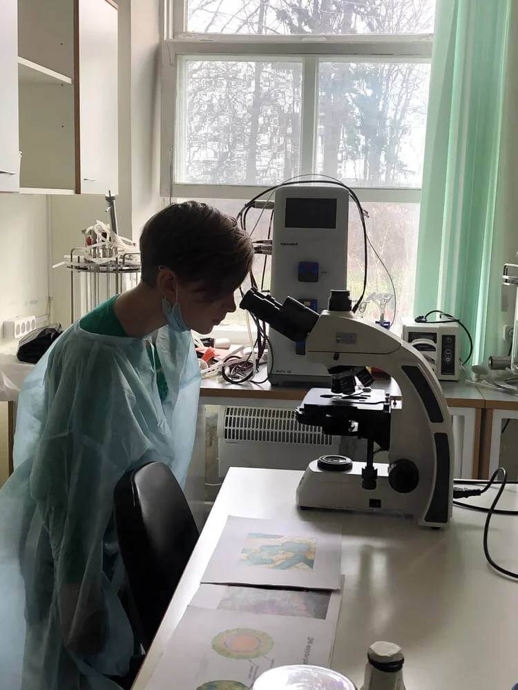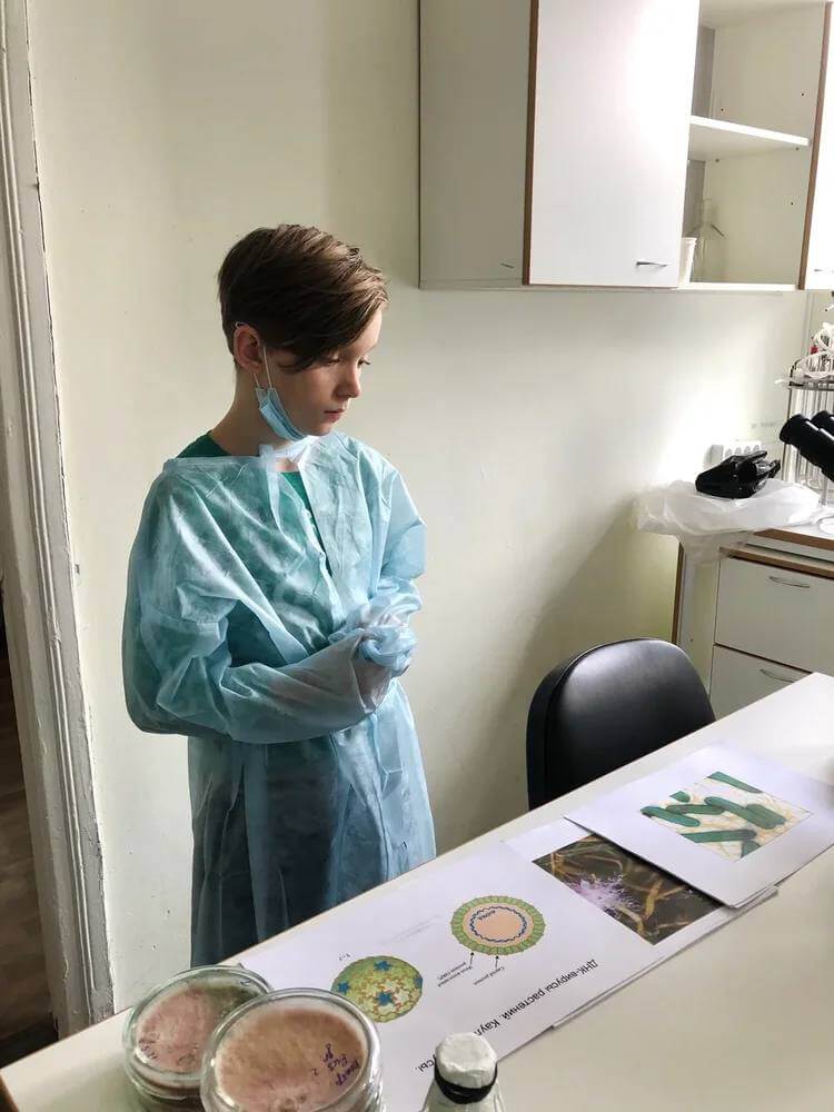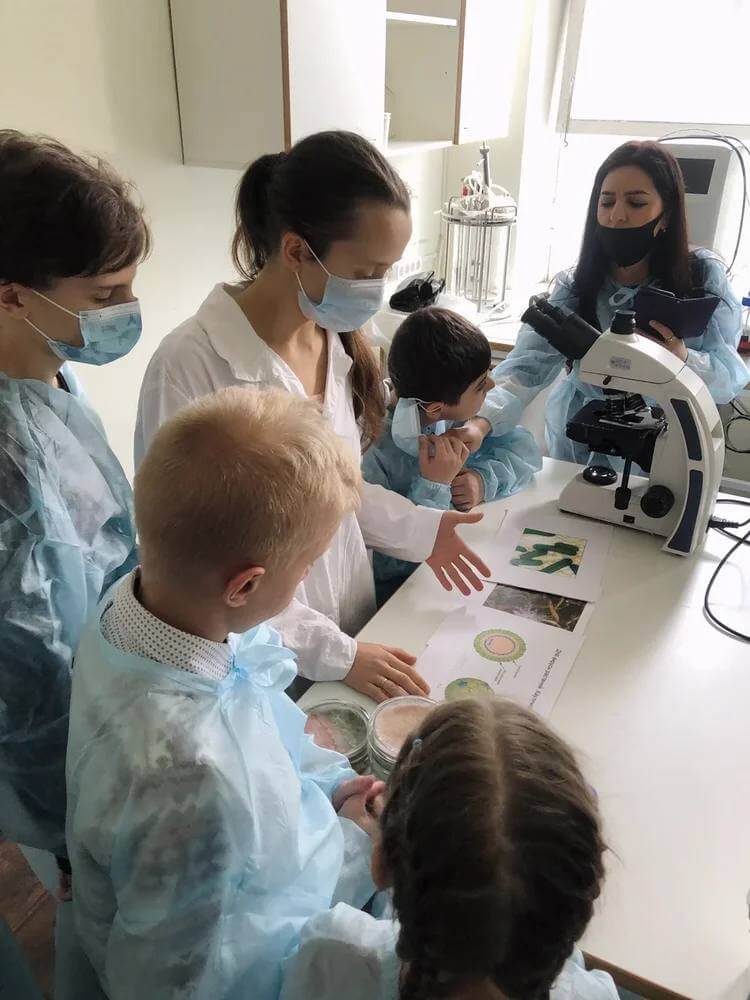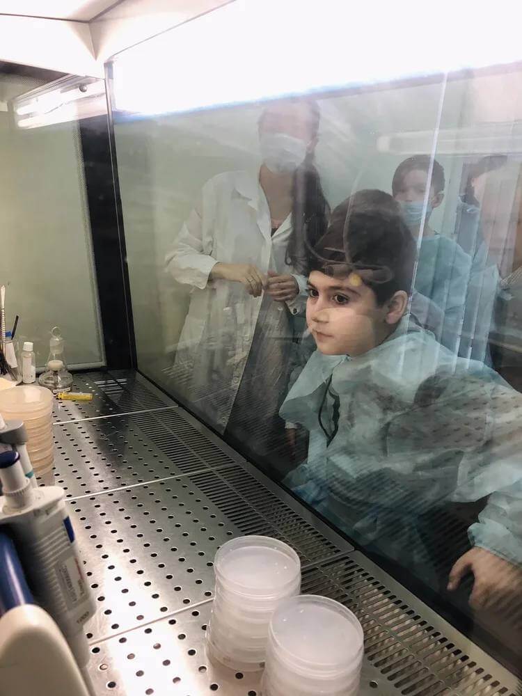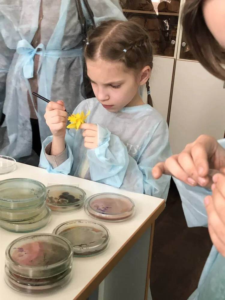 В научном центре было очень интересно побывать в лабораторных комнатах и самим исследовать неизвестные приборы, колбочки и стекляшки. Будущие биологи с интересом рассматривали под световым микроскопом пыльцу цветов и слушали рассказ о том, чем болеют растения. Лабораторные опыты начались с посевов бактерий отпечатков пальцев, воды и даже воздуха, а продолжились дома, когда в чашечке, предварительно стерилизованной в ламинарном боксе, вдруг появились бактерии!