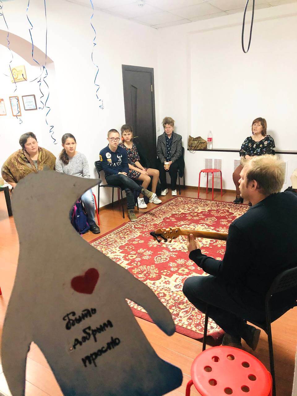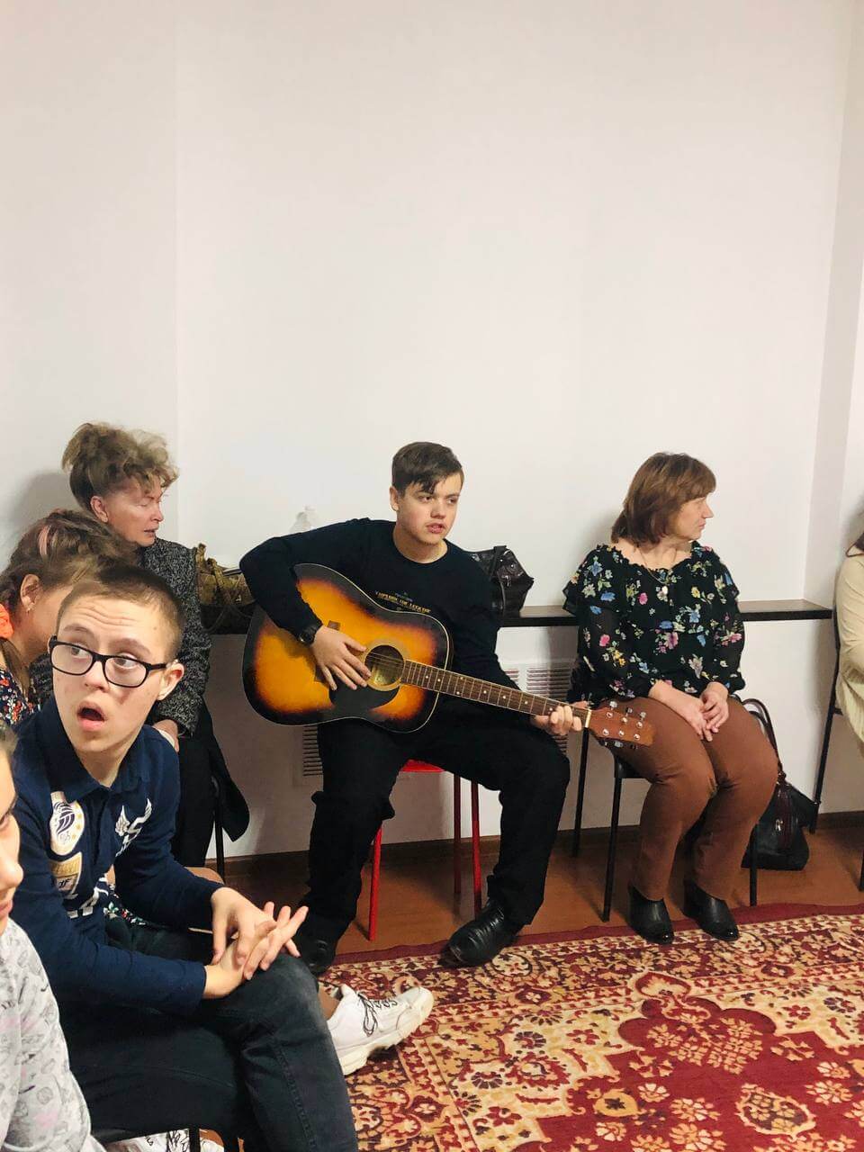 Чтобы затронуть особые струнки в душах наших подопечных подростков и помочь им социализироваться, мы собрались в музыкальной студии, куда нас пригласил Анатолий — преподаватель игры на гитаре, в нашем детском центре развития «Верь в себя»