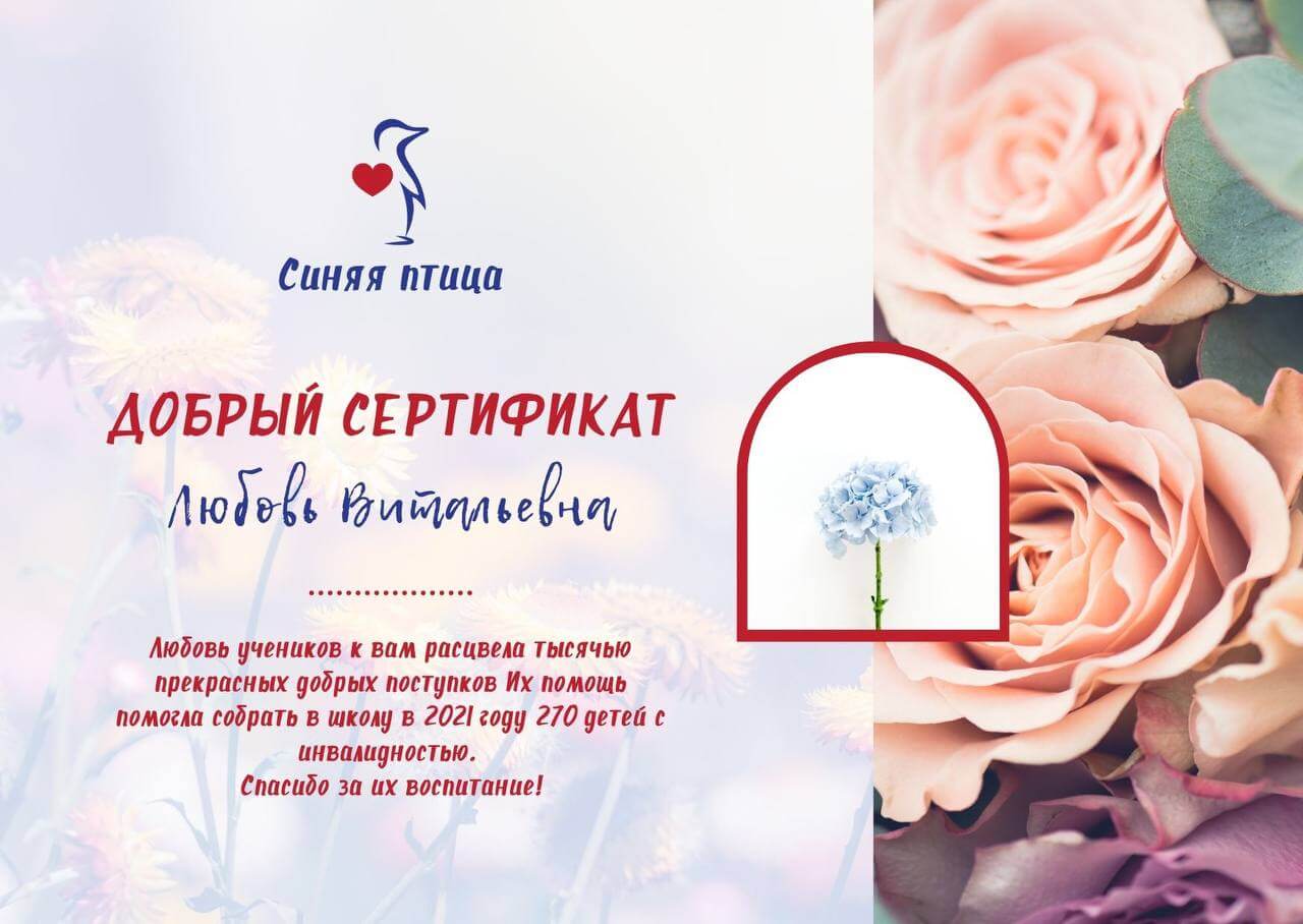 А с нас — поздравительный сертификат для учителя, где написано, что любовь к нему вдохновила детей, и букеты превратились во много-много добрых поступков.
