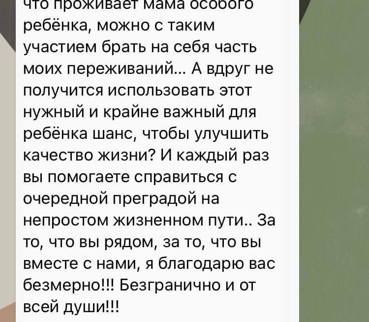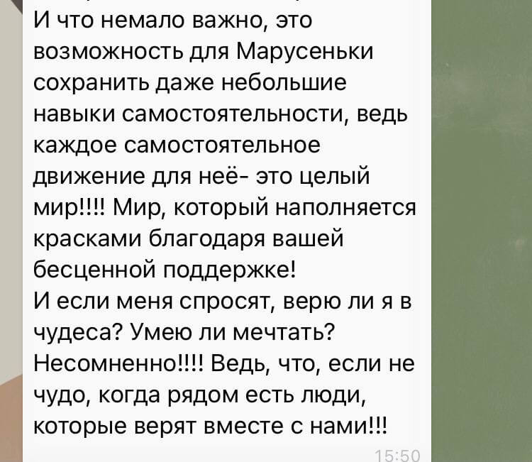 «Вот уже несколько лет подряд, благодаря вашему бесценному труду и поддержке благотворителей, людей с огромным добрым сердцем, Марусенька проходит курсы реабилитации и занимается со специалистами, которые помогают не только сохранить, но и приобрести такие важные навыки. Две недели с Машей работали специалисты, которые очень стараются помочь не допустить ухудшений и обрести умения, которые так важны для сохранения качества жизни. Ежедневно с Машей занимались инструктор Лфк, массажист и логопед- дефектолог. Это команда, которая работает с Марусей шестой год и я смело могу сказать, что все совместные усилия идут на пользу!»