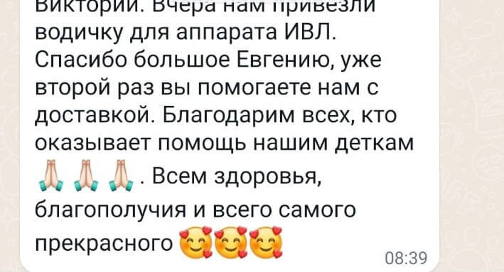 Всё дети проекта в паллиативном состоянии и дыхание у них непосредственно осуществляется напрямую через трахеостому. Кислород поступает не увлажненный. Дистиллированная вода используется для увлажнения дыхательных смесей аппарата искусственной вентиляции легких. Без увлажнения можно навредить ребенку, пересушить лёгкие и дыхательные пути, что в дальнейшем может привести к бронхитами и кровотечениям.