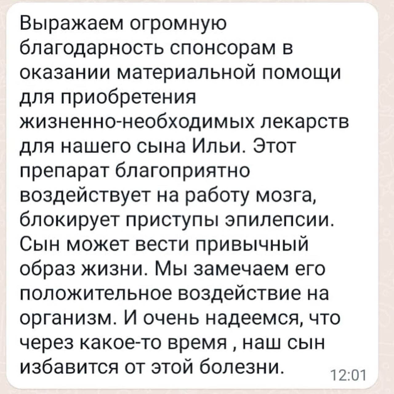 «Выражаем огромную благодарность спонсорам в оказании материальной помощи для приобретения жизненно-необходимых лекарств для нашего сына Ильи. Этот препарат благоприятно воздействует на работу мозга, блокирует приступы эпилепсии. Сын может вести привычный образ жизни. Мы замечаем его положительное воздействие на организм. И очень надеемся, что через какое-то время , наш сын избавится от этой болезни»-делится радостью мама Ильи.
