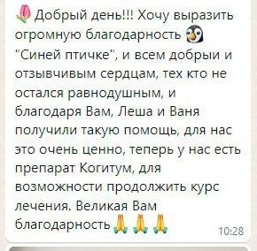 «Добрый день!!! Хочу выразить огромную благодарность «Синей птичке», и всем добрым и отзывчивым сердцам, тех кто не остался равнодушным, и благодаря Вам, Леша и Ваня получили такую помощь, для нас это очень ценно, теперь у нас есть препарат Когитум, для возможности продолжить курс лечения. Великая Вам благодарность»- делится мама