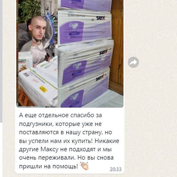 «Дорогая наша «Синяя птица« В очередной раз благодарим Вас за такую огромную и своевременную помощь! Страшно представить чтобы мы без вас делали. Вы наши ангелы-хранители! Благослови Вас Господь! А еще отдельное спасибо за подгузники, которые уже не поставляются в нашу страну, но вы успели нам их купить! Никакие другие Максу не подходят и мы очень переживали. Но вы снова пришли на помощь!« -делится мама Макса