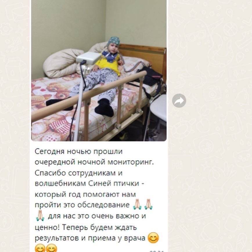 «Сегодня ночью прошли очередной ночной мониторинг. Спасибо сотрудникам и волшебникам «Синей птички» — который год помогают нам пройти это обследование, для нас это очень важно и ценно! Теперь будем ждать результатов и приема у врача.»-делится мама Гоши.