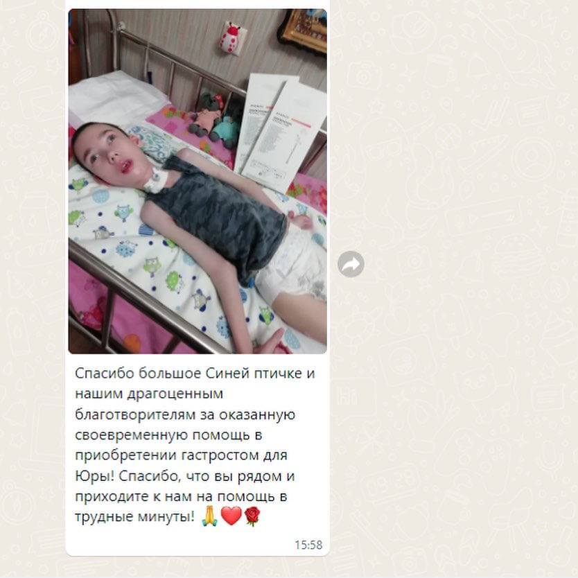 «Спасибо большое Синей птичке и нашим драгоценным благотворителям за оказанную своевременную помощь в приобретении гастростом для Юры! Спасибо, что вы рядом и приходите к нам на помощь в трудные минуты! 🙏❤️🌹»