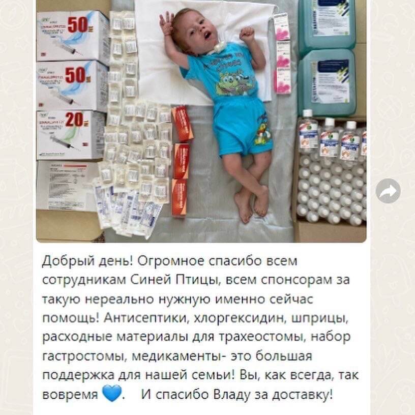 «Добрый день! Огромное спасибо всем сотрудникам Синей Птицы, всем спонсорам за такую нереально нужную именно сейчас помощь!Антисептики, хлоргексидин, шприцы, расходные материалы для трахеостомы, набор гастростомы, медикаменты- это большая поддержка для нашей семьи! Вы, как всегда, так вовремя. И спасибо Владу за доставку!»-делится мама.