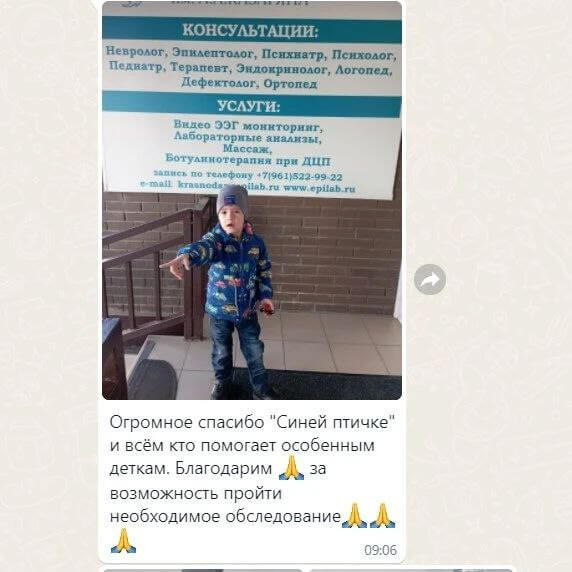 «Огромное спасибо «Синей птичке» и всём кто помогает особенным деткам. Благодарим за возможность пройти необходимое обследование!».