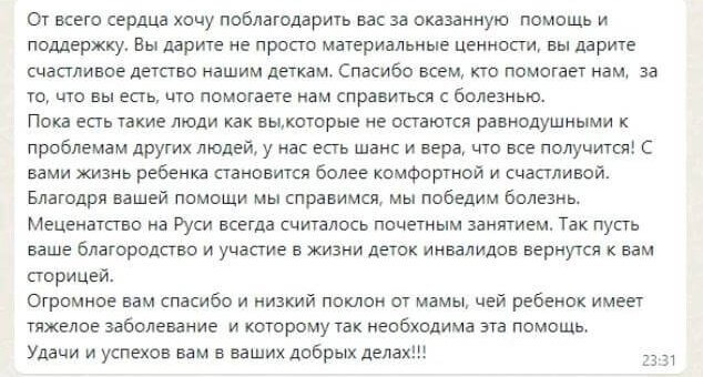 «От всего сердца хочу поблагодарить вас за оказанную помощь и поддержку. Вы дарите не просто материальные ценности, вы дарите счастливое детство нашим деткам. Спасибо всем, кто помогает нам, за то, что вы есть, что помогаете нам справиться с болезнью.