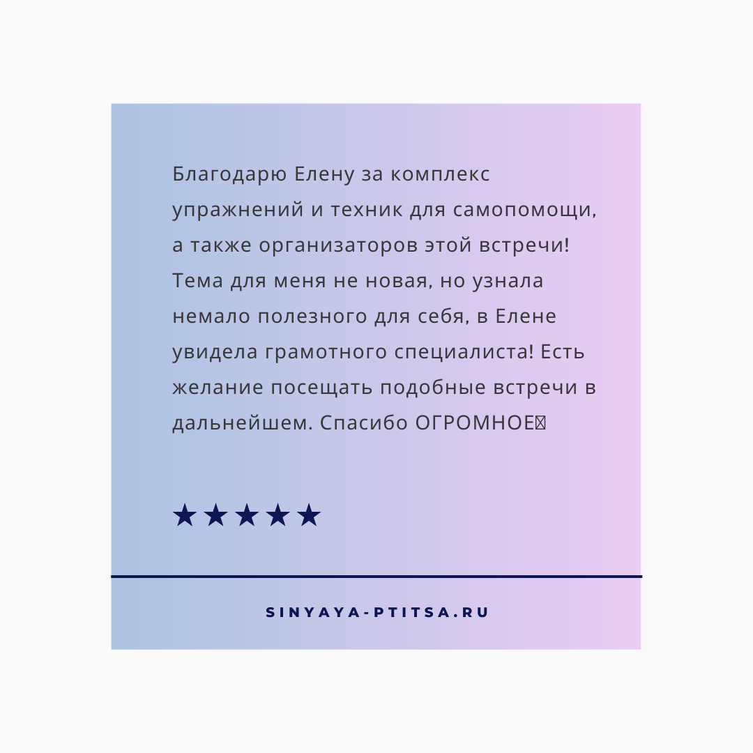 Елена уникальный специалист, потому что ею движет не только профессиональное чувство долга, но и личные мотивы — многое пережито и преодолено благодаря этим знаниям. И хотя приёмы расписаны до конца года, Елена очень хотела поделиться бесценным багажом знаний с Клубом для мам. В карточках делимся отзывами