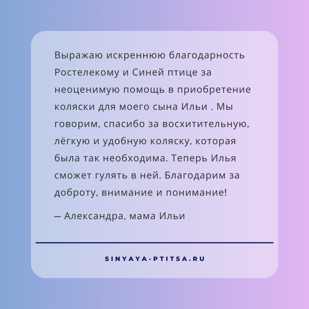 Благодарим компанию ПАО «Ростелеком», которая полностью оплатила коляску для Ильи и помогла быстро закрыть кампанию помощи Вики. Многолетняя поддержка позволила закрыть уже больше десятка кампаний помощи и оперативно закупать даже самые дорогие медикаменты и оборудование.