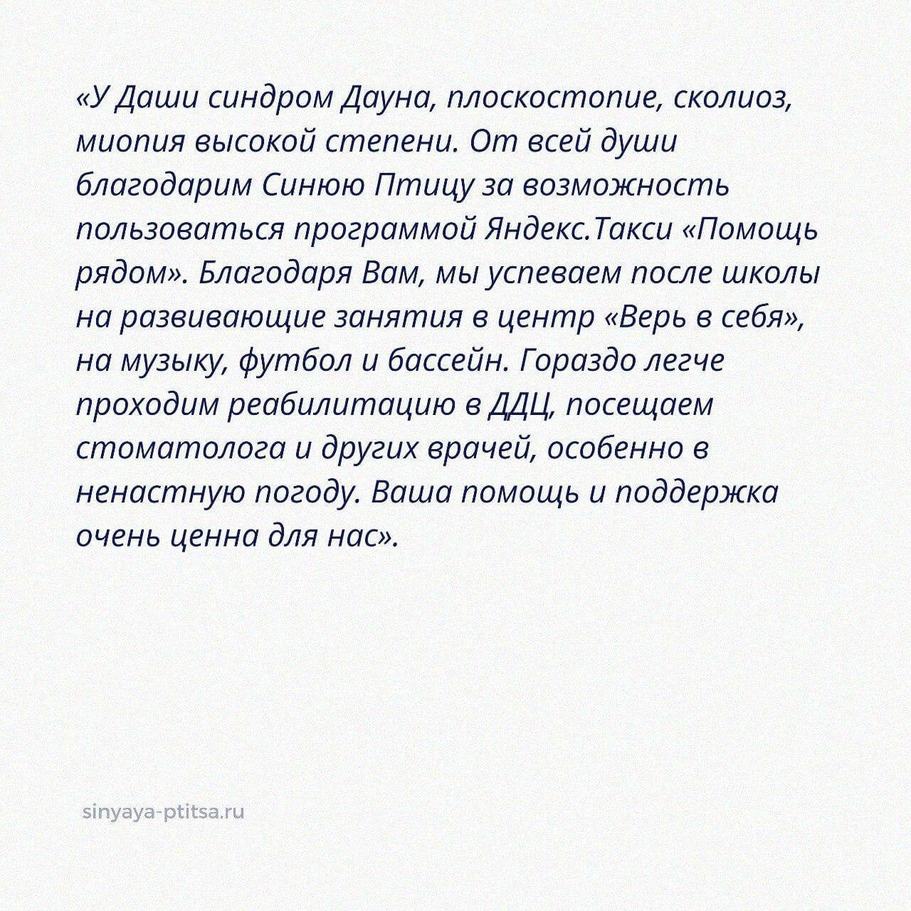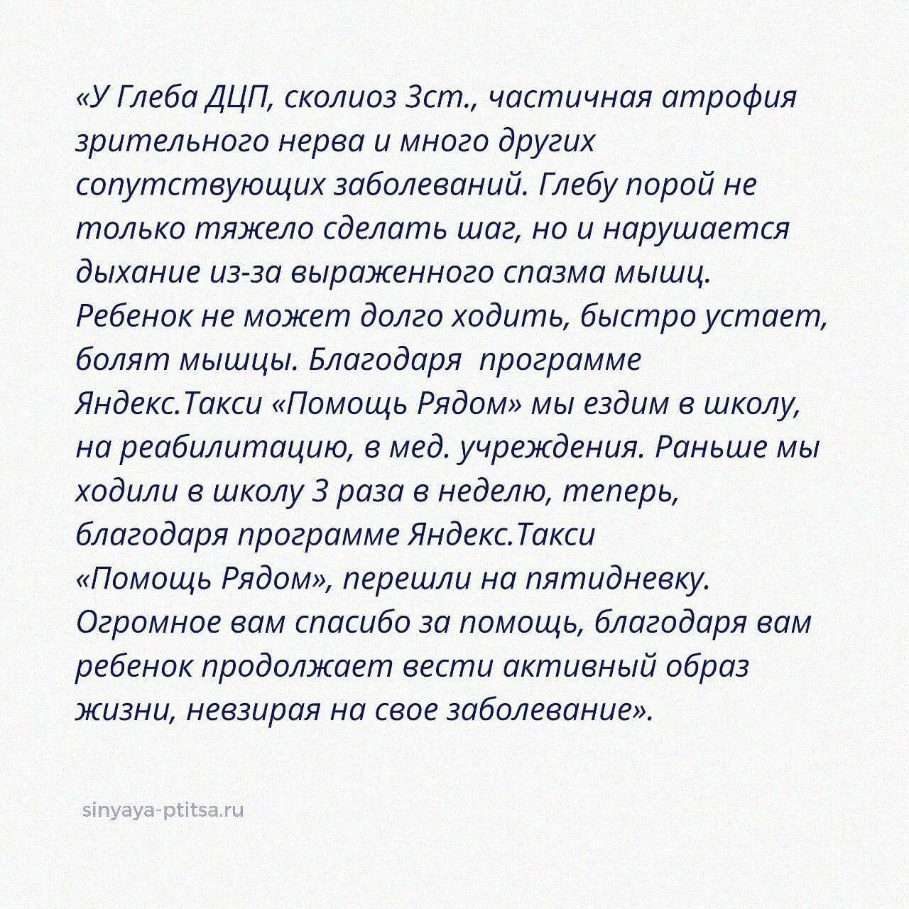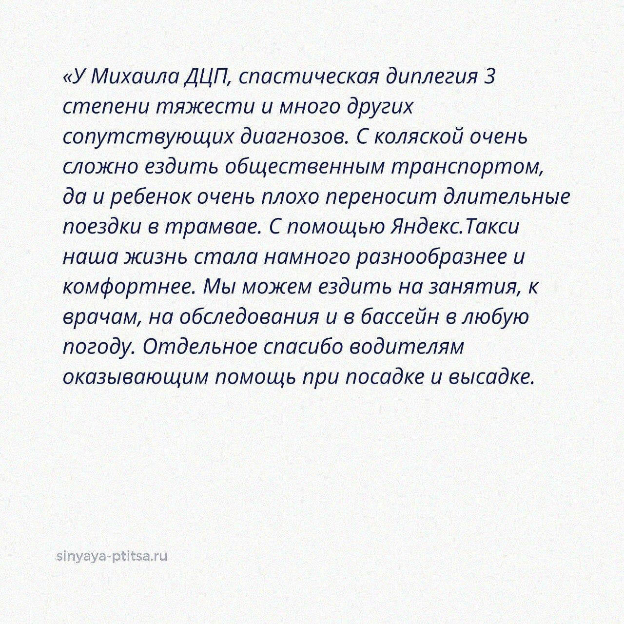 - «У Саши множество диагнозов, связанных с двигательными нарушениями и поведенческими расстройствами. Нам трудно переоценить важность помощи, которую оказывает нам сервис Яндекс-такси, программа «Помощь рядом». В нашей жизни много мероприятий, занятий, медицинских обследований, добираться до которых было бы крайне сложно без вашей замечательной программы! Мы безмерно благодарны вам за такое благое дело!».