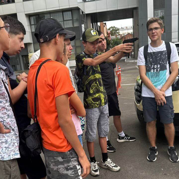 Ребята посидели внутри машины, узнали как она устроена, провели учебные занятия по стрельбе и примерили бронежилеты. Каждый участник экскурсми получил именную грамоту о прохождении миникурса инкассатора.