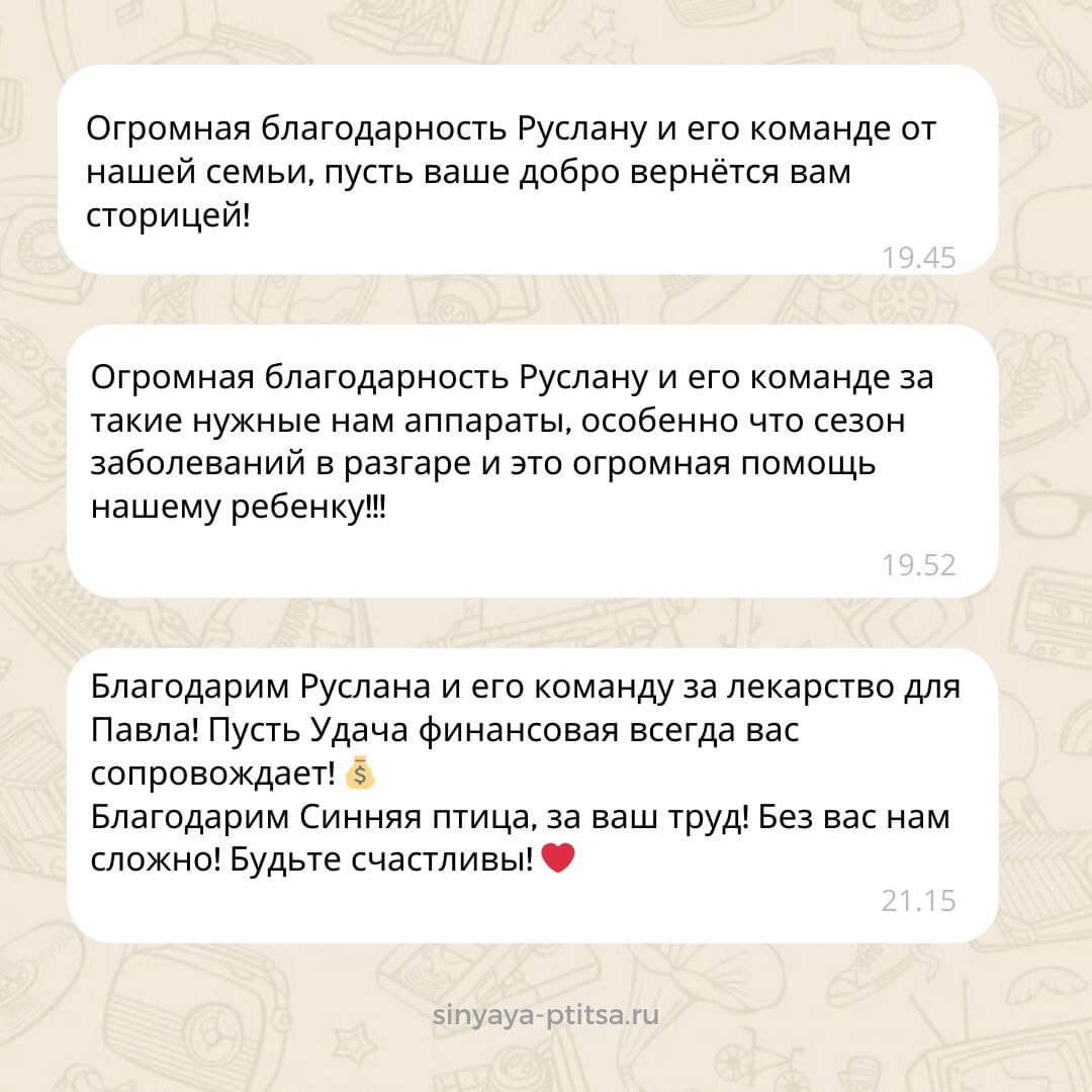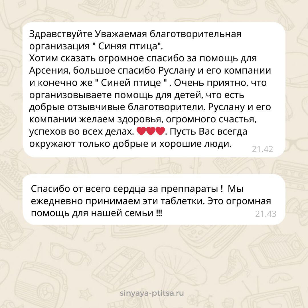 «От всей души благодарим «Синюю птицу», Руслана и его команду за оказанную помощь с лекарствами для дочки!!! Препараты железа, магний и витамин Д необходимы для восполнения дефицитов в организме и постоянно выписываются врачом. Наша семья искренне благодарит всех, кто помогает! Для нас это неоценимый вклад, т. к. постоянно приходится преобретать дорогие препараты».