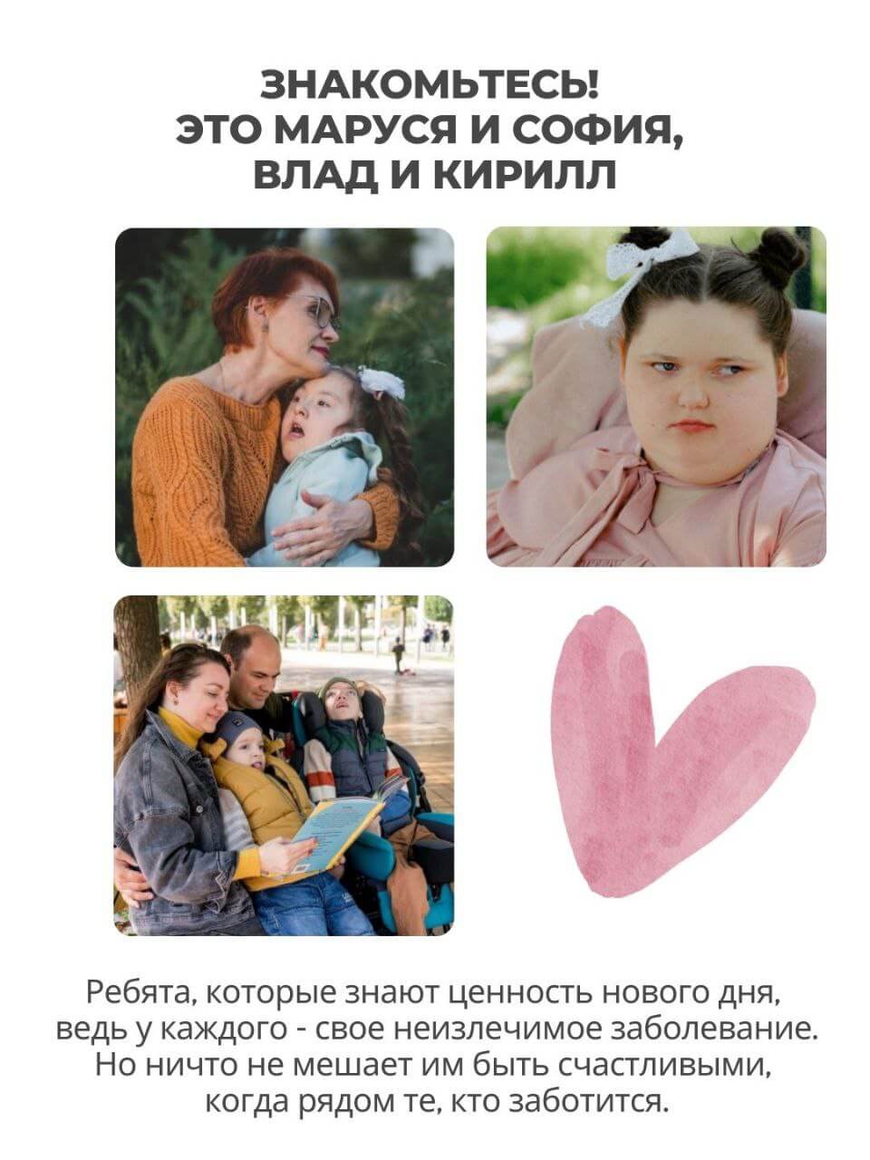 У всех ребят есть одна общая черта — невероятная сила внутри. Потому что каждый живёт с неизлечимыми, порой очень редкими заболеваниями и каждый день — это маленький подвиг.
