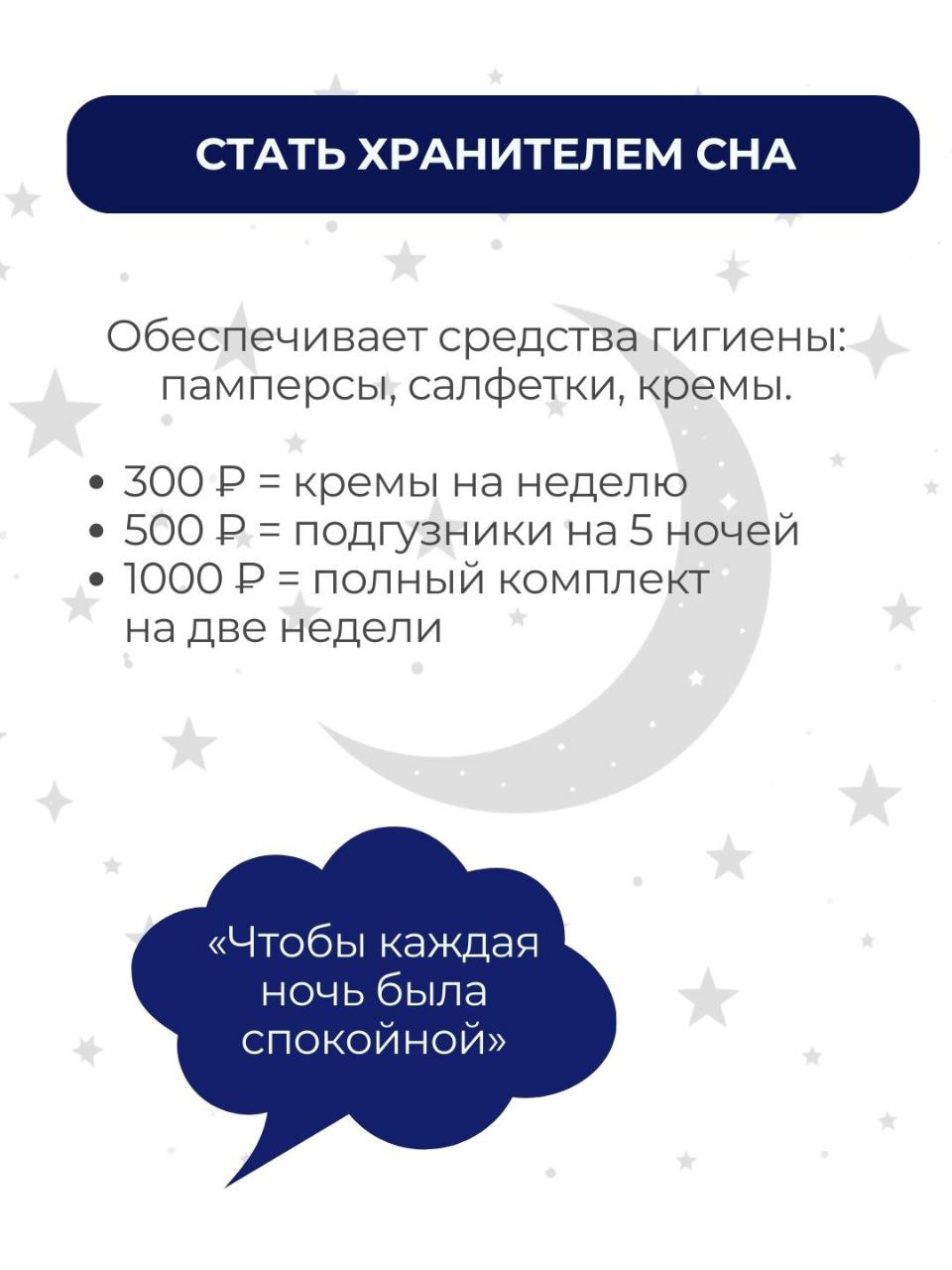 ХРАНИТЕЛЬ СНА — обеспечивает средства гигиены (памперсы, салфетки, кремы). Чтобы ночи были спокойными, а кожа — без раздражений.