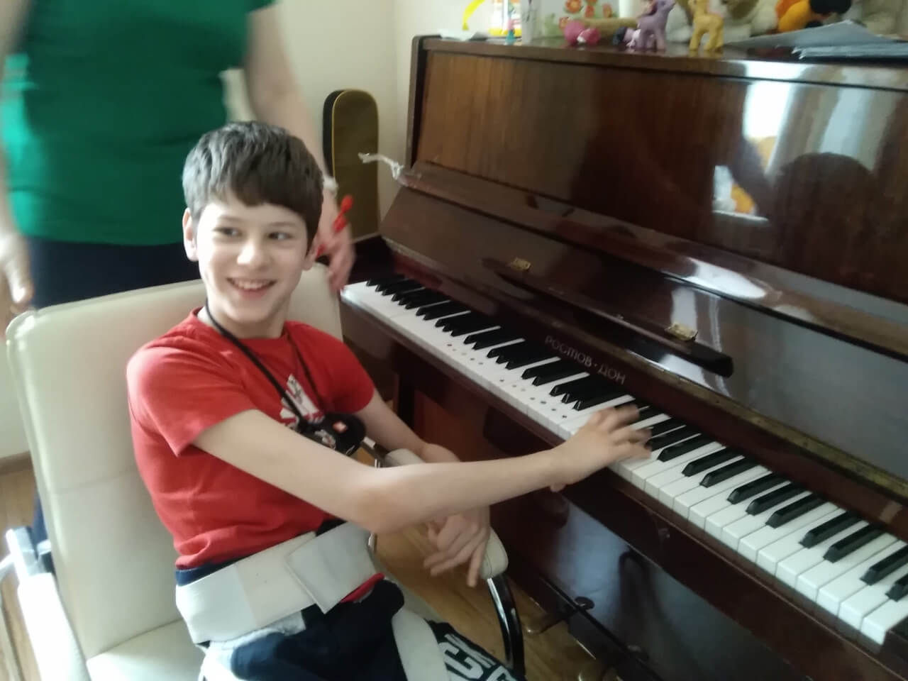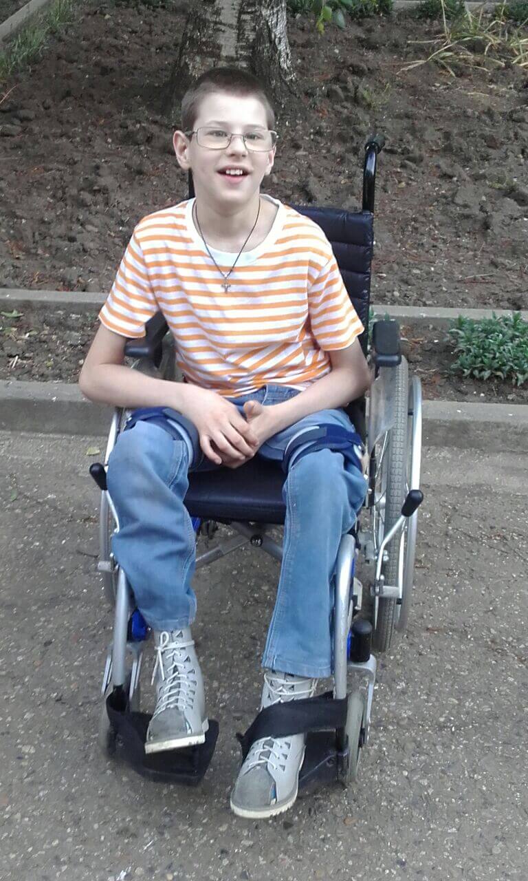 Эта коляска правильно фиксирует тело до и после занятий. Это очень важно, так как большую часть своей жизни Артём пока ещё будет проводить в ней. Без такой коляски успешно проходить реабилитации мальчику будет сложно. Почти невозможно.