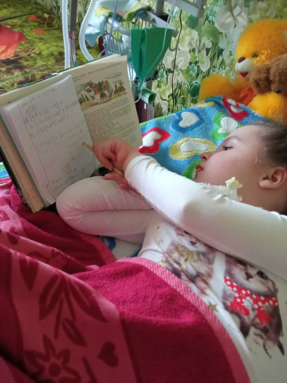 «Викуля учится в 5 классе, на домашнем обучении. Любит математику, английский язык и рисование. Ведет свою страничку в социальных сетях. Рисует и пишет лёжа, но это её не останавливает. С её рисунков наша знакомая Дианочка сделала календарь на 2021 год. Как и любая девочка, она обожает смотреть свои любимые мультфильмы…конечно это «Холодное сердце» и «Рапунцель». Из-за слабого иммунитета мы редко выходим на улицу. Самая большая мечта — гулять каждый день».