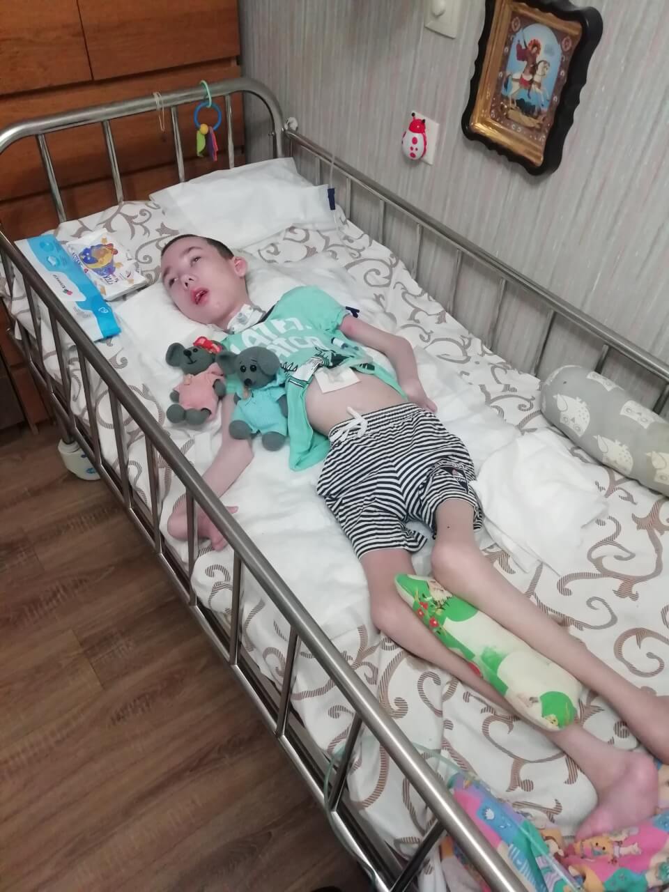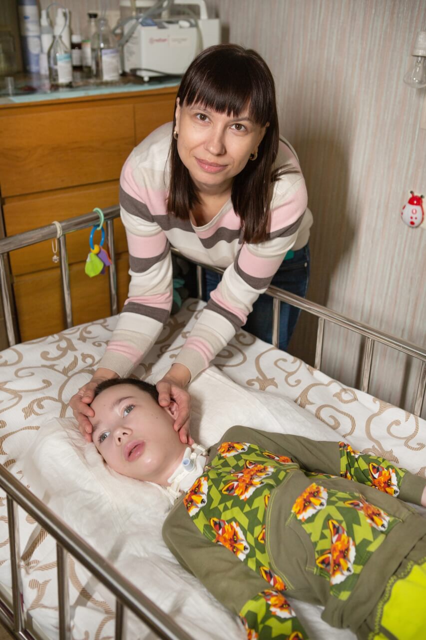 «Последние три года сынок лежит в кровати практически без движения.» — Рассказывает мама Людмила. — «Не улыбается и мало, что понимает.»